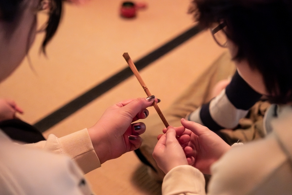 Students practice sitting and receiving a bowl of tea