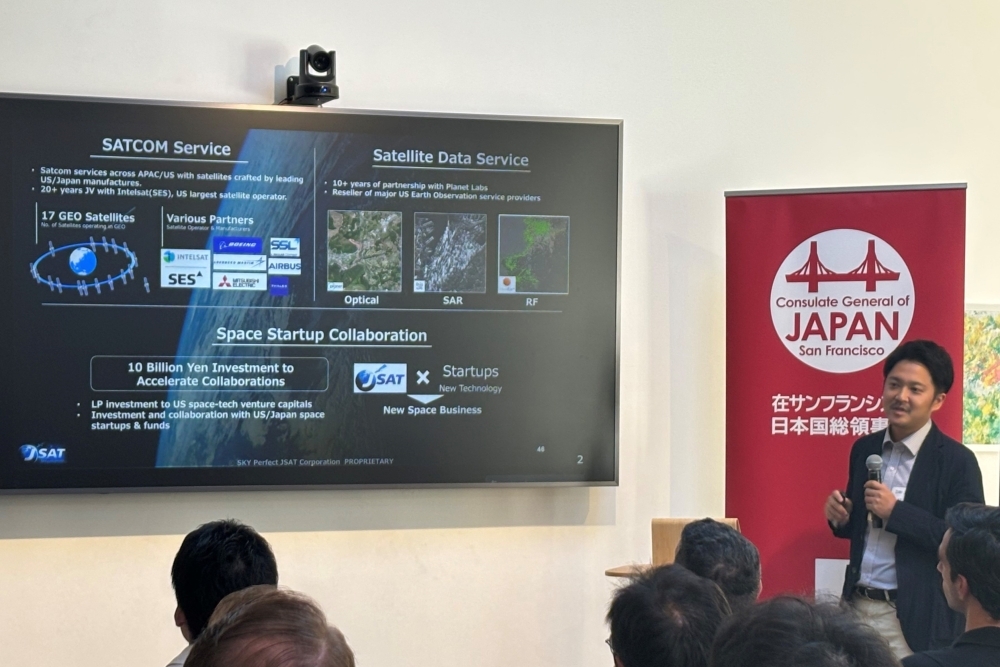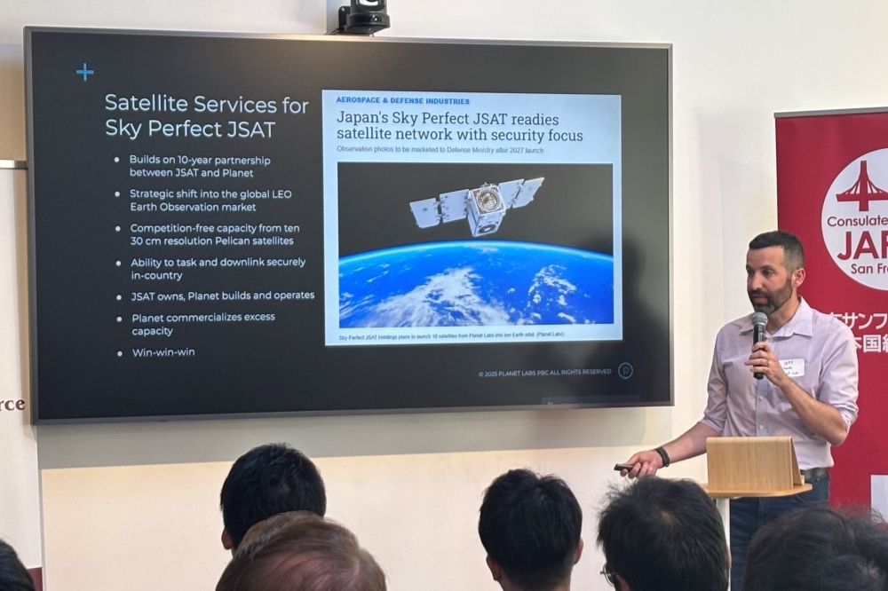 次に、プレゼンテーションが行われ、Planet Labsのミッション・イネーブルメント担当シニアディレクターであるジェフ・グイド氏と、JSATインターナショナル西海岸事務所の鈴木一生代表が登壇しました。グイド氏と鈴木氏は、JSATとPlanet Labsのパートナーシップについて語り、デュアルユース分野の企業がどのように新たな協業を築くことができるかについてアドバイスを提供しました。
